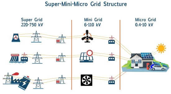 The structure of future EPSs may be represented in an aggregate form as a three-level super-mini-micro-system (Figure 1 in []). Super systems include large power plants (thermal, hydraulic and nuclear), large parks of wind and solar power plants, energy storages of large capacity and transmission networks of high and super-high voltages, including delivery points transmitting power to the next level, to the level of mini-systems. Mini-systems include power mini-sources connected to a distribution network (thermal power mini-plants, mini-plants on the basis of gas turbine, gas piston, steam turbine and other technologies, mini-parks of wind and solar power plants), system power mini-storages, as well as distribution grids themselves, including distribution substations. In a mini-system, the unit capacity of mini-sources and power storage is unambiguously determined not to exceed 25 MW [,]. Micro-systems include micro-turbine power plants, isolated wind mills and photo panels, power micro-storages and internal electric networks of households or of their clusters and public and production facilities with a voltage of 6/0,4 or 20/0,4 kV. The unit capacity of micro-sources and micro-storages even when taking into account multiple estimates can be assumed not to exceed 25 kW [,].