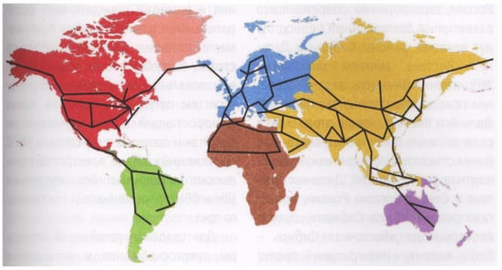 Electric power generated by these mega centers shall be transmitted long distances, which is a driving force for creating the super-high voltage Global Energy Interconnection [] (Figure 3). We should like to note that [] demonstrates, in a sense, fantastic potential of renewable power generation by 2050 for 143 countries. Furthermore, according to estimates given by the authors of [], refusal of conventional energy sources would allow for the reduction of energy consumption by more than 55%.