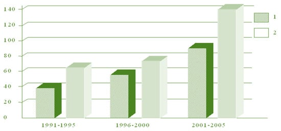 A more complicated structure of developing EPSs on the background of general growth of installed capacity and scales of energy interconnections aggravate consequences of system cascading emergencies, which is confirmed by the USA statistics for 1991–2005 (Figure 4) []. Unfortunately, the author did not find more recent data, such as in EPSs [], but he believes in this objective trend for complicated EPSs with a large value of generating installed capacity and heterogeneous electrical network structure under the influence of innovative technologies.