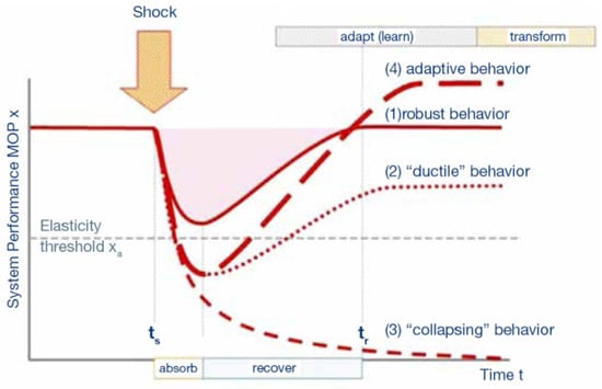 The abovementioned definition shows that survivability includes damping and adaptation abilities of the system that were considered in [] as applied to resiliency, and its ability to recover. A comparison of key components of the two terms additionally proves their identity (Figure 5 and Figure 6): the elasticity margin and marginal state; the move to collapse and catastrophic cascade process; adaptive behavior and recovery; robust behavior and opposition to cascade propagation of the emergency (the first component of the comparison belongs to resiliency, the second one to survivability).