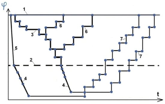 A Russian term corresponding to “resiliency” as applied to EPSs is “survivability” that is defined as the ability of the system to withstand emergencies preventing their cascade propagation which are followed by a large-scale interruption of power supply to consumers, and the ability of the system to restore its initial state or the state close to it []. Let us make some comments on what is illustrated in Figure 6 to explain the term “survivability of EPS”: line 1 shows the level of a normal operation state before the emergency; line 2 presents the so-called marginal (limiting) state, which is lower then the triggering event and the EPS meets a catastrophic uncontrollable cascading process, which notes by number 4; line 3 shows the cascading process before the marginal state and triggering event, when the emergency control system and operating personnel try to prevent (interrupt) the cascading disturbance and to restore the normal state of the EPS (lines 6); line 5 presents an extreme disturbance like a storm, earthquake and so on; line 7 shows the recovery (restoration) stage.