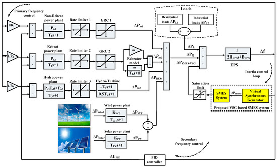 The simulation results of the considered renewable power system (i.e., EPS) are implemented under various load/RES perturbations using MATLAB/Simulink® software to check the superiority and efficacy of the proposed VSG based on the SMES system. Furthermore, the efficacy of the proposed VSG based on the SMES system in low-inertia power grids is validated by comparing its performance with that traditional VSG approach based on battery ESS in references [10,12,13,14,15,16,17]. In this work, the battery ESS was mathematically modeled by a first-order transfer function of a time constant of 10 s and a unity gain, and the same power constraints of the SMES system mentioned in Section 3.1 are used with the battery ESS system. The studied EPS comprises both conventional power plants (e.g., steam, gas, and hydropower plants) and RESs as shown in Figure 2. Besides which, the uncertainties of RESs/loads, system nonlinearities (e.g., GRC and GDB) are considered in designing the proposed VSG based on the SMES system. Preservation of the frequency stability of the considered low-inertia power grid is verified through the following scenarios at different operating conditions.