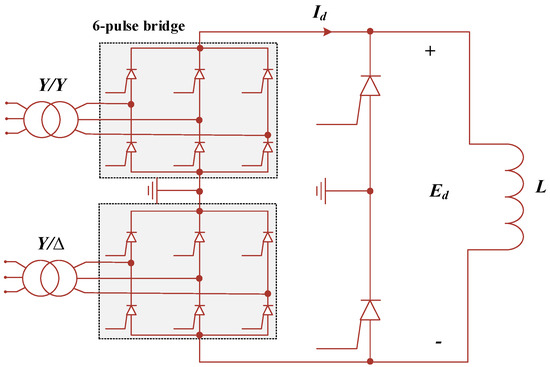 The SMES coil is interfaced into the power grid at the point of common connection (PCC) through the 12-pulse bridge-based thyristors (i.e., silicon controlled rectifiers (SRCs)) and the transformer as shown in Figure 3. The function of the (Y-Δ)/(Y-Y) transformers is to regulate the voltage into the SMES conversion system based on the SRCs [25]. During the charging and discharging mode of the SMES coil, the bypass thyristors are turned off. On the other hand, when the two bypass thyristors are fired at the same time, the SMES coil operates in the freewheeling state (i.e., the SMES coil does not charge or discharge). The SMES coil should have a closed loop to ensure the coil current is always circulating and to avoid destroying the power devices.