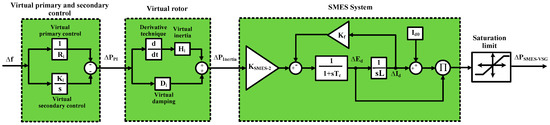 The ESS is needed to emulate the inertia power and damping properties required by the power system. Due to the attractive properties of SMES, such as unlimited numbers of charging/discharging cycles, fast response, and high efficiency [20], this paper proposes a new VSG scheme based on the SMES system to increase the frequency stability of a low-inertia power grid as displayed in Figure 5. Technically speaking, the frequency control loops in the traditional power grids can be classified into primary and secondary, and the synchronous generator uses the turbine governor as the primary control to adjust the system frequency [10]. The droop control is typically utilized in the power system to sustain the system frequency at the permitted range by controlling the turbine power. Moreover, in large power systems, the LFC is utilized to sustain the system frequency at its standard value for a period ranging from a few seconds to a few minutes after the system disturbance [12]. Consequently, similar primary and secondary frequency controllers can be constructed for the VSG as a droop controller and integral controller, respectively. Thus, the virtual primary and secondary controls (shown in Figure 5) are combined representing the proportional-integral (PI) controller and the output power from the virtual control loops () can be expressed as