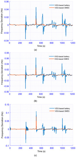 In this scenario, a high-share RES penetration is used to test the proposed VSG shown in Figure 9. Besides, the same heavy random load in scenario 1 is used (Figure 7). The comparison is made under conditions of 100% of system inertia (i.e., high system inertia), 60% of system inertia (i.e., medium system inertia), and 20% of system inertia (i.e., low system inertia). Figure 10 displays the frequency response of the studied power grid with the proposed VSG design based on the SMES system under high-share RES penetration and heavy random loads in conditions of 100%, 60%, and 20% of system inertia, respectively. From the obtained results, the proposed control strategy based on the SMES system significantly improves the performance of system frequency and gives a low system transient magnitude compared to the traditional design that depends on battery ESSs in low-inertia power grids. On the other hand, the studied EPS with the traditional VSG design based on battery ESSs is oscillating with large frequency deviations resulting from the severe shortage in the system inertia. Despite the low-inertia coefficient, the proposed VSG design based on the SMES system can preserve the frequency stability of the low-inertia power grid considering renewables. The studied power grid performance specifications; MOS, MUS, and Ts with the proposed VSG design based on the SMES system and the traditional VSG design based on battery ESSs during this scenario are given in Table 6.