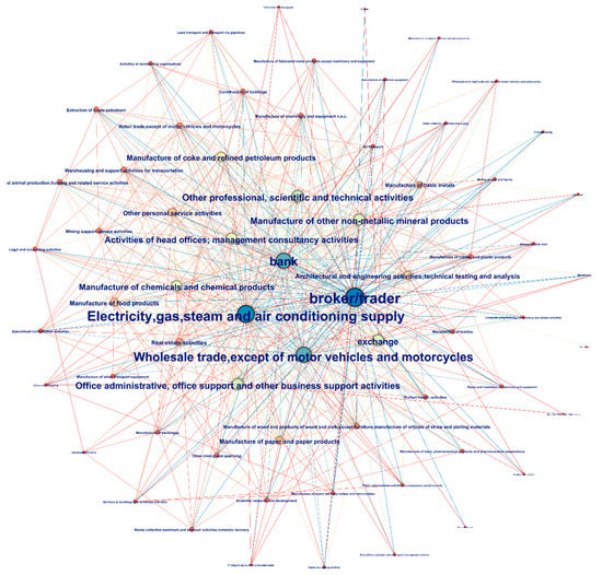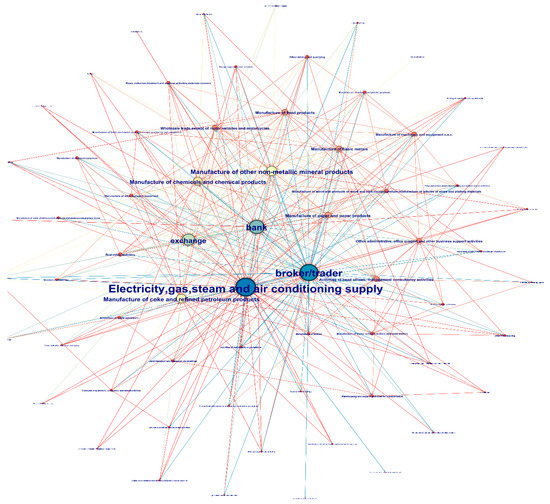There are 66 nodes in the layout of Phase I, and 65 nodes of Phase II. The industry of EGSAS and intermediaries are located in the center of the layout in both phases (Figure 1 and Figure 2), meaning they play the role of connecting marginal nodes in the entire transaction network. From the center to the edge of the layout, the participation of the industries gets lower. For example, the industry of ‘manufacture of leather and related products’ located in the bottom of the network (Figure 1) has only one edge, as it only conducts one transaction in the whole phase.