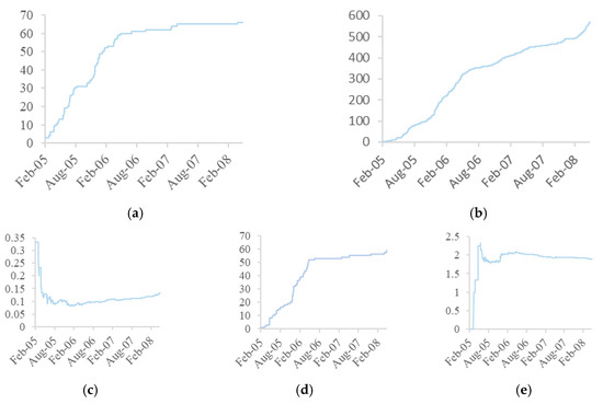 Evolution of the trading network in Phase II: (a) Number of nodes; (b) number of edges; (c) network density; (d) number of components in max strongly connected components; (e) average shortest path length.
