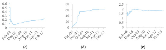 There are many similarities between the impact patterns of industries on the trading network in Phase II and Phase I, while the difference lies in three main points. First, EGSAS still have the greatest impact on network density in the first half of the second phase (Figure 6a). Starting from the mid-term, broker has begun to surpass EGSAS and has the greatest impact on the network density. Second, WTEM has minimal impact on density and the shortest path of network in the first half of Phase II. The impact gradually increases from the mid-term. At the end of the second phase, the impact of the WTEM on the network density is almost the same as that of bank, and the impact on the average shortest path length even exceeds that of bank. This may be driven by the macro-economic environment in Europe: After the global financial crisis and the European debt crisis, the industry of WTEM shows a good development trend, and therefore has stronger influences in the carbon allowance trading system. Third, although the existence of the exchange industry has increased the density of the transaction network, it has no positive effect on the shortest path of the network (Figure 6c). Instead, it even increases the average shortest path length, which may be attributed to the fact that it only serves a few important industries in the trading network [25].