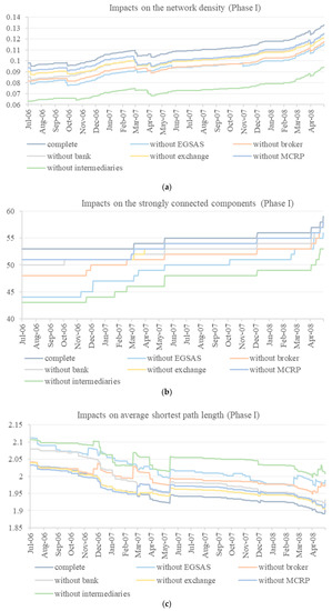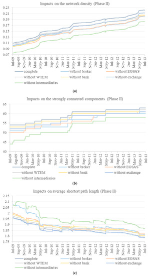In Phase I, EGSAS has the most significant impact on the network density (Figure 5a), followed by broker, bank, exchange, and MCRP, which is consistent with the research results in Section 4.4. When taking broker, bank, and exchange as whole financial intermediaries, their impacts on the network are much stronger than EGSAS. With respect to the max strongly connected components, EGSAS and whole financial intermediaries have significant impacts on it (Figure 5b), especially in the beginning of the phase. Despite this, a fragmentation of the trading network would not result without these industries, as most other industries still exist in the max strongly connected components. It has been widely known that financial intermediaries play important functions in providing liquidity of allowances [20,21]. However, with the evolution of trading network, the impacts of EGSAS and whole financial intermediaries on the network become weaker, which is indicated by the narrowing gap between the line of complete network and network without these industries in the end of this phase (Figure 5b). This may be because participants rely much more on intermediaries in the beginning of the phase, because they have no experience in the new market, while they have more choices when they know the market much better. As for the average shortest path length, only EGSAS, bank, and broker have significant impact on it (Figure 5c). Starting from exchange, the following industries have little impact on the length of path, meaning the role of these industries are just participation instead of providing channels for allowance transfer.