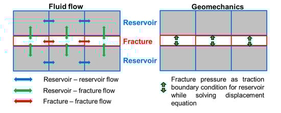 Fluid flow and geomechanics coupling between reservoir and fracture domains.