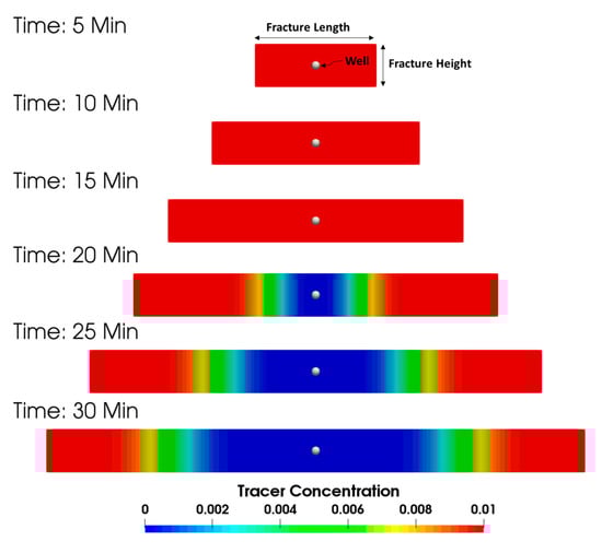Fracturing fluid was injected at a constant injection rate for 30 min. The tracer slug was injected for 15 min at a constant concentration (0.01 by volume). Tracer concentration inside the propagating fracture is shown in Figure 4. During the early time of fracture propagation, tracer concentration in the hydraulic fracture is the same as the injected tracer concentration. Once the tracer injection is stopped, injected fracturing fluid displaces the tracer towards the fracture tips and in the reservoir through leak-off. At the start of the flowback, tracer concentration near the wellbore is very low. Flowback tracer concentration starts with a very low value, and a Gaussian type tracer response curve with a single peak was observed, as shown in Figure 5.