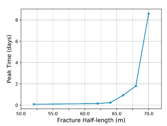Normalized tracer concentration vs. time is plotted on a semi-log scale for all reservoir permeability cases (Figure 6). It was observed that an increase in the reservoir permeability leads to an early peak in the tracer response curve. An increase in reservoir permeability leads to an increase in the tracer dilution due to the higher flow rate of reservoir fluids from the matrix to fracture during flowback. Also, in case of lower fracture length (higher matrix permeability), the tracer penetrates deeper into the matrix, and dilution of tracer occurs due to mixing with the reservoir fluid. This tracer dilution leads to a decrease in the tracer peak concentration in higher matrix permeability cases, and increased dispersion is observed in the tracer response curve. Figure 7 shows the plot of peak tracer concentration vs. fracture half-length. The peak tracer concentration during flowback was observed to increase with an increase in the fracture length. The time at which tracer concentration reaches the peak value was measured for each case and is plotted vs. fracture length (Figure 8). It was observed that the time of peak concentration is directly proportional to fracture length, and this correlation can be used to obtain qualitative information about fracture length.