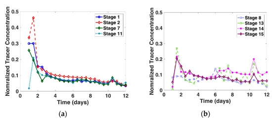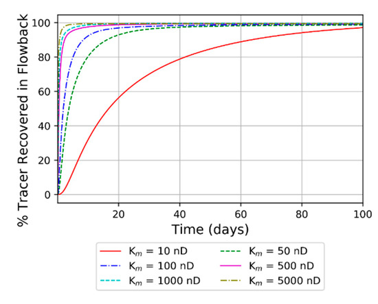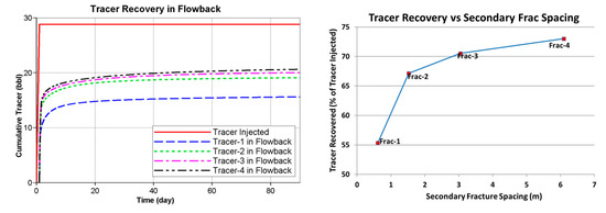 Figure 9 shows the plot of tracer recovery (as a percentage of tracer injected) against time. Since fracture closure was not modeled in these simulations, almost 100% recovery of the injected tracer was observed during flowback. However, several field studies have shown very low tracer recovery [19,20,37]. The tracer retention due to fracture closure can help in understanding the low tracer recovery, which is explained in the next section.