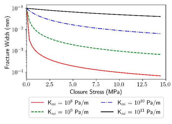 Barton-Bandis normal contact stiffness relationship [28] is used to model fracture closure. Bandis et al. [28] derived a relationship between the normal contact stress acting on a closing fracture surface and the amount of closure by conducting several experiments of rock joints deformation under normal loading. The magnitude of fracture closure can be related to offset width, stiffness, and fracture width. The contact relationship from Bandis et al. [28] is simplified in [29], which is shown in Equation (4).