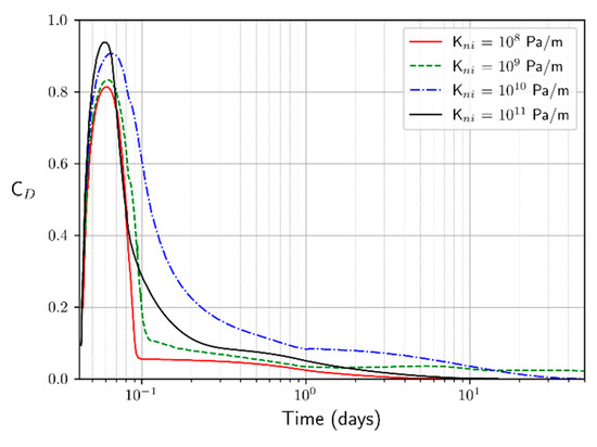 The impact of fracture closure on the tracer response curve and tracer recovery was analyzed. During flowback, increased effective stress on the fracture faces can lead to fracture closure. This fracture closure hinders the tracer transport from the fracture to the wellbore. The fracture closure phenomenon is modeled using the Barton–Bandis normal contact stiffness relationship [28]. The magnitude of fracture closure depends on the fracture stiffness and offset width. In this section, the fracture stiffness was varied (from 108 Pa/m to 1011 Pa/m) to analyze the impact of fracture closure on the tracer flowback. Reservoir permeability (1 µD) was same for all cases. Figure 10 illustrates the sensitivity of stiffness on the fracture width during the closure. It was observed that the rate of fracture closure is inversely proportional to the stiffness.