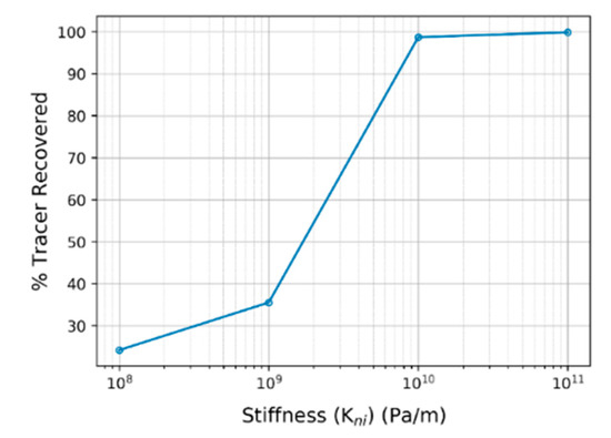 Percentage tracer recovered decreases with a decrease in the fracture stiffness. At lower fracture stiffness, fracture closure is faster, and this leads to tracer retention in the fracture and the reservoir.