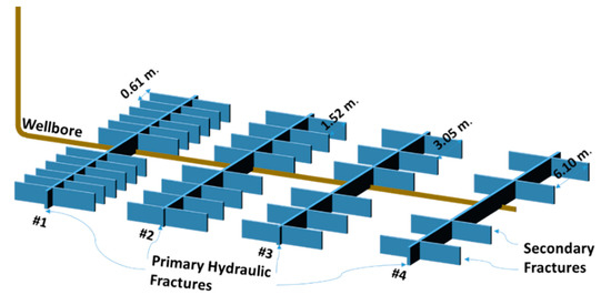 In this section, the effect of secondary fracture intensity on the flowback tracer concentration of a multifractured horizontal well was analyzed. A simulation case was set up with four static fractures on a single wellbore having a different spacing of secondary fractures (Figure 14). A dual porosity-dual permeability model was used, and secondary fracture spacing was varied from 0.61 m to 6.1 m (2 ft to 20 ft). The Barton–Bandis fracture permeability model [28] was used to analyze the secondary fracture closure effects. Each fracture was tagged with a unique tracer, and an equal volume of tracer was injected in all four fractures.