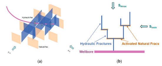 - Weng, X.; Kresse, O.; Cohen, C.E.; Wu, R.; Gu, H. Modeling of hydraulic fracture network propagation in a naturally fractured formation. In Proceedings of the SPE Hydraulic Fracturing Technology Conference, The Woodlands, TX, USA, 24–26 January 2011; Society of Petroleum Engineers: Richardson, TX, USA, 2011. [Google Scholar] [CrossRef]