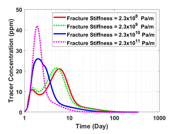 Impact of fracture stiffness (rate of fracture closure) on the tracer response curve.