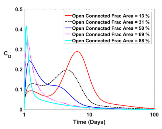 Next, the impact of the created fracture area, which is open and connected (FOC as shown in Figure 20) to the wellbore was analyzed. Figure 23 shows that multiple peaks can be observed when IU fracture closure leads to a reduction in the open connected (FOC) fracture area. It was observed that the first open-connected segment flows back early and contributes to the first peak. When the area of the open connected segments is smaller, then early time tracer recovery is lower, and the fracture segments connected via IU fractures lead to the late time tracer peaks. The first peak concentration is found to be proportional to the area of the open-connected segments. Hence, the volume of tracer recovered under the first peak can provide information regarding the fraction of the created fracture network that is open and connected to the wellbore.
