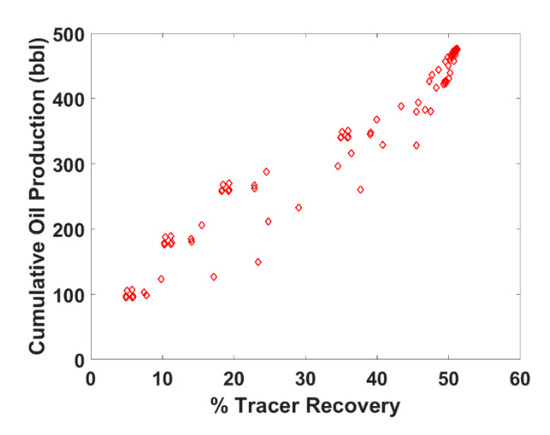 4.5. Tracer Recovery vs. Hydrocarbon Production