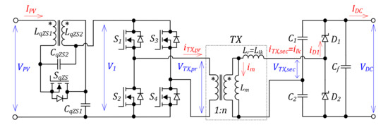 Like other IBBCs, the input voltage regulation range of the qZS IBBC is subdivided into two regions, i.e., the buck and boost regions. In the boost region, the input voltage is stepped up using the shoot-through pulse width modulation (ST-PWM) [11]. When the operating point moves to the buck region, the voltage is stepped down using various control methods ranging from the phase-shift modulation (PSM) [12] and variable frequency control [13] to asymmetrical PWM [12] and topology morphing control [14,15]. In the boundary between the boost and buck modes, the qZS IBBC operates as a series resonant converter in a nonregulated DC transformer (DCX) mode. In the classical design approach [11], dimensioning of the isolation transformer depends on the desired position of this boundary point (which is also known as a pass-through operation point), i.e., it defines transformer turns ratio along with selection of the optimal values of its leakage and magnetizing inductances. The turns ratio defines the gain of the converter in the DCX mode while the properly dimensioned leakage and magnetizing inductances ensure the quality factor of the resonant tank and soft switching performance, which are essential for achieving high values of efficiency.