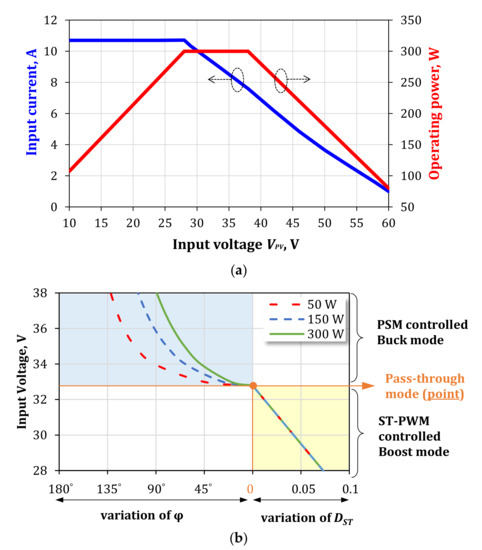 Isolated buck–boost converters (IBBCs) [1] are widely used in applications requiring regulation of the input or output voltage in a wide range at high efficiency along with the voltage level matching between the input and output ports. The photovoltaic (PV) microconverters [2,3,4], also known as the parallel-type DC power optimizers, are highly demanding examples of the IBBC application, which must ensure high performance at low realization complexity and cost. The range of input voltage regulation is the important performance metric of the PV microconverters (PVMICs), which enables the realization of the shade-tolerant Maximum Power Point Tracking (MPPT) using the P-V curve sweep technique [5]. Moreover, owing to the extended input voltage regulation capability, the PVMIC could be paired with different types of PV modules regardless of the number of cells and maximum power point voltage. On the other hand, the demands of high weighted efficiency and low production cost typically push designers to limit the input voltage regulation range below 1:2 to achieve higher efficiency values at a more affordable cost [6].