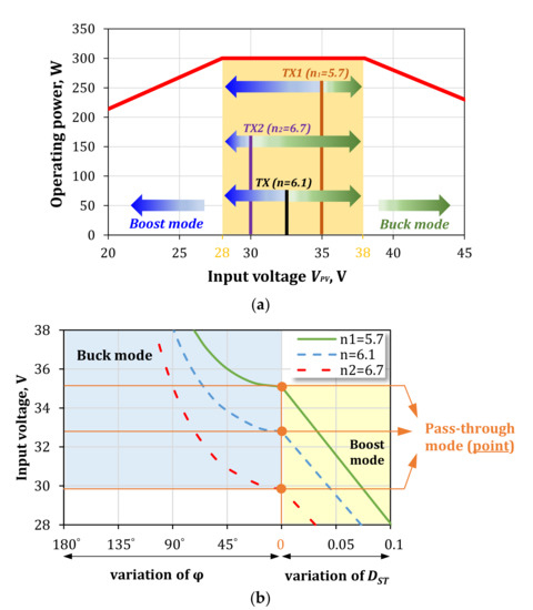 As was mentioned previously, the front-end inverter of qZS IBBC has an embedded buck–boost functionality; depending on the applied control method the inverter can either step down (Buck mode) or step up (Boost mode) the input voltage. The boundary operating point between the modes is usually selected according to the most probable maximum power point (MPP) voltage of the unshaded PV module, where the PVMIC is expected to operate at maximum power for most of the time [3]. For the modern 60-cell PV modules, such operating point could lie in the range from 28 to 33 V, while for the 72-cell PV module, this range is shifted to 34–38 V. Therefore, the design of a universal PVMIC with compatibility with 60- and 72-cell Si-based PV modules should consider the wide range of probable MPP voltages, which is typically as wide as 28–38 V. To match the high demands on the performance of the PV power electronics, the PVMIC within this range should demonstrate the highest weighted power conversion efficiency regardless of the operating mode, which is a nontrivial task for a designer. The best results here could be achieved by the optimization of multimode control by proper selection of the turns ratio of the transformer in combination with the software-based efficiency optimization methods such as cycle-skipping modulation or topology-morphing control [14,15,16,17].