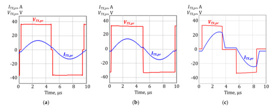 Simulated primary voltage and current waveforms of three key study isolation transformers at VPV = 33 V and operating power of 300 W: (a) the boost mode with DST = 0.03 for TX1 with n1 = 5.7, (b) the DCX mode for the baseline transformer TX with n = 6.1, and (c) the buck mode with φ = 73.8° for TX2 with n2 = 6.7.