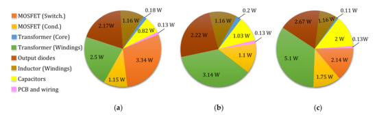 Distribution of power losses at the input power of 300 W for the turns ratio of: (a) n1 = 5.7, (b) n = 6.1, and (c) n2 = 6.7.