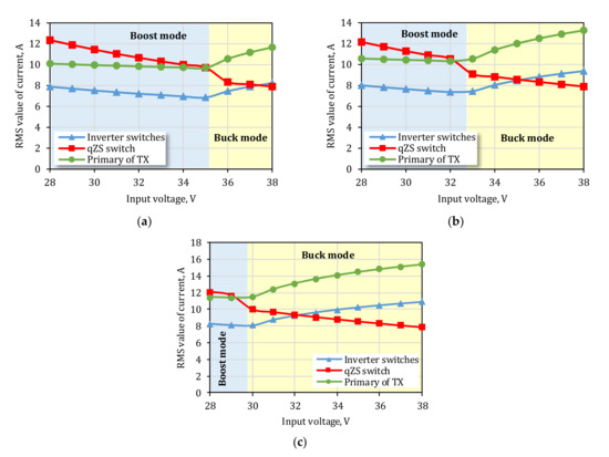The validity of the comparison above could be substantiated by evaluating the RMS currents in the converter. According to the proposed model of power losses, most of the windings and conduction losses are proportional to the square values of the RMS currents. Figure 7 shows the variation of the RMS current of the inverter switches, the qZS switch, and the primary windings of the isolation transformer within the given input voltage operation range for the three compared isolation transformer designs. As can be appreciated from Figure 7, for all three turns ratios, the RMS current of the transformer primary windings and the inverter switches decreases with a slight slope in the boost mode. The trend is inverse for the buck mode, where the RMS current of the inverter switches and the isolation transformer is rising with an increase in the input voltage.