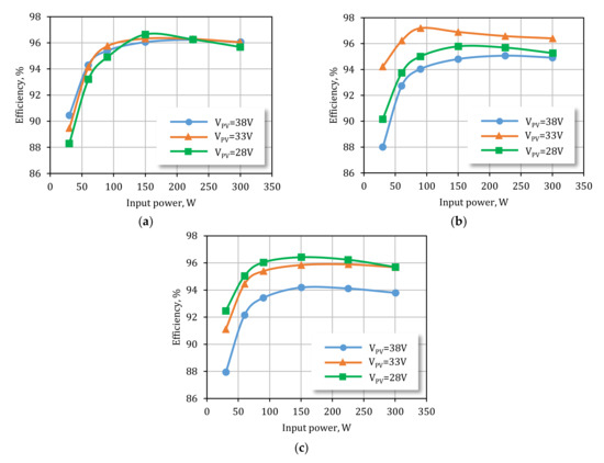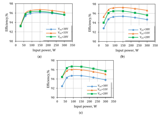 A comparison of estimated efficiency between three operation points for each of the selected turns ratios is shown in Figure 8. Figure 8a shows that the differences between the efficiency curves at the three input voltages for the case of n1 = 5.7 are insignificant. This could be explained based on Figure 7 where the RMS currents of the switches and the isolation transformer show the smallest variation for n1 = 5.7. A smaller variation of the RMS current between the operation modes results in a small difference between the power loss and efficiency values. As a result, the efficiencies of the converter for the three different operation voltages are close to each other. For the turns ratio of 5.7, the converter operates in the boost mode at the input voltages of 28 and 33 V. In the boost mode, higher input voltage results in lower RMS currents of the transformer and switches, which yields reduced power loss and increased efficiency at VPV = 33 V. As could be expected from Figure 7, the peak efficiency is achieved at VPV = 33 V. At light loads, the values of the efficiency are nearly the same at all three input voltages. Comparing the cases of VPV = 28 V (boost mode) and VPV = 33 V (buck mode), it could be concluded that the efficiency curves are nearly the same since the reduced RMS currents in the boost mode (reduced conduction and windings losses) are compensated with higher switching losses.
