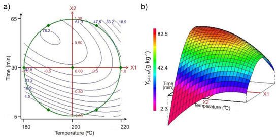 Two- (a) and three-dimensional (b) depictions of WS fraction Y5-HMF as a function of reaction temperature and holding time, which were calculated by means of the above models, are presented in Figure 2. The contour plots, which are shown in Figure 2a, represent the curves of the constant value of the approximate responses of Y5-HMF using the quadratic models.