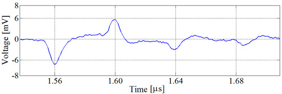 The scheme of the specimen under test inserted between the electrodes of the PEA cell is shown in Figure 2, while the experimental PEA cell output signal is reported in Figure 3.