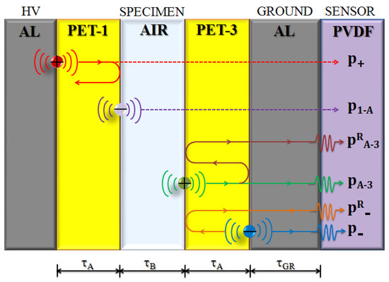 Based on these values, including those reported in Table 1, the acoustic wave behavior within the PEA cell and the specimen can be described as shown in Figure 5.