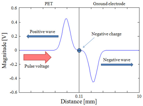 Before describing the behavior of the other acoustic waves, it is important to explain the acoustic wave generation. In particular, when a charge is subjected to vibrations, two acoustic waves with opposite polarity are simultaneously generated. If the charge has a positive sign, a positive acoustic wave is generated and directed toward the sensor. Simultaneously, a negative acoustic wave is generated and directed in the opposite direction. On the contrary, if the accumulated charge has a negative sign, the wave directed towards the sensor is negative, while that directed in the opposite direction is positive. For this last case, Figure 11 can be observed.
