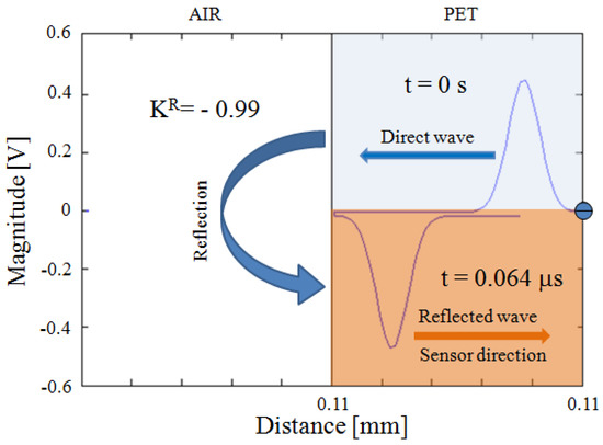 As can be seen in Figure 4, due to the same dielectric material used for the specimen, the transmission coefficient between each PET/PET interface is equal to 1. This means that the acoustic wave passing through the two layers of PET in contact with each other is totally transmitted. Meanwhile, the reflection coefficient in the same PET/PET interfaces is equal to 0.