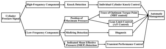 The cylinder pressure sensor is the most common means of in-cylinder combustion diagnosis and control. Its typical application scenarios are summarized in Figure 1 [24]. With its high-frequency characteristics, it is able to do knock diagnosis and control. With its low-frequency characteristics, it can be used for closed-loop control of maximum brake torque timing (MBT) and air-fuel ratio (A/F). It can also be applied for misfire diagnosis and transient performance control. The following will give a brief overview of the application of cylinder pressure in these fields.