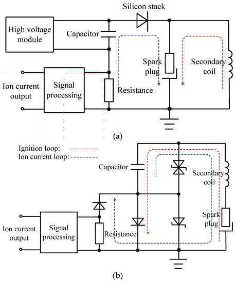 One is called direct current power (DC-Power) ion current detection system. Its basic circuit is shown in Figure 2a. On the basis of retaining the original ignition circuit, an ion current detection circuit is connected in parallel. The high voltage power supply module provides DC voltage for the ion current circuit. The capacitor connected in parallel with the high voltage module plays the role of voltage stabilization and energy storage, and its capacitance determines the speed of voltage attenuation. The high voltage silicon stack is used to isolate the instantaneous high voltage generated during ignition so that the electronic components will not be damaged. Another system named the capacitive ion current detection system is shown in Figure 2b. When ignition happens, the discharge current charges the capacitor and is used as the voltage supply to drive the ion current. Since the ion current loop is in series with the ignition loop, various diodes such as transient suppression diodes, fast recovery diodes, Schottky diodes are employed in this circuit to suppress the damage of discharge surge to electronic components. Due to the lack of high voltage modules to continuously charge the capacitor, it is necessary to consider the attenuation of the capacitor voltage. For the engine test, the capacitor is charged once after each cycle of ignition, so the capacitor only needs to ensure sufficient voltage in one cycle. Through calculation, the capacitor charging energy in the circuit is only 0.5 mJ, which is not enough to affect normal ignition process. Besides, the energy consumption of the capacitor in each cycle is only 10% when the data acquisition is completed. Therefore, the voltage decay process of the capacitor can be ignored. The original ion current signal obtained from two detection systems is processed with the same signal processing method including signal differential and resistor-capacitance filtering.