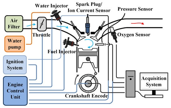 Figure 5 shows the schematic diagram of the engine test bench. The engine is equipped with an intake port water injector and a direct fuel injector. The water rail pressure is 0.4 MPa and the fuel rail pressure is 10 MPa. The spark plug is not only used for ignition, but also an ion current sensor. A side-mounted non-water-cooled pressure sensor is employed to record the in-cylinder pressure trace. The engine prototyping control unit is of type National Instruments® CompactRIO, including a field-programmable gate array (FPGA) module, a real-time controller, and reconfigurable input/output (RIO) modules. The reconfigurable chassis with embedded FPGA is the core of the embedded system. It has an ultra-fast timing resolution of 25 ns. The FPGA module is directly connected to RIO modules, which can access RIO circuits at high speed and flexibly implement functions such as timing, triggering, and synchronization. The real-time controller contains an industrial-grade processor that provides multi-rate control, process execution tracking, on-board data storage, and communication with external devices. The RIO modules contain isolation and conversion circuits, signal conditioning functions, which can be directly connected to industrial sensors or actuators, providing a variety of connection options. This prototyping unit is able to control throttle, ignition coil, injector, UniValve® system, and other actuators.