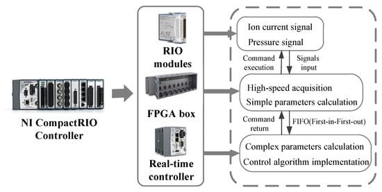 Apart from basic engine control function, the ion current/cylinder pressure cooperative combustion diagnosis and control algorithm are also implemented on CompactRIO as shown in Figure 6. The ion current and cylinder pressure signals are strictly synchronized into the FPGA chassis via the analog input modules. The FPGA box executes high-speed acquisition of two signals and simple parameters calculation, such as the maximum cylinder pressure and its position, the maximum ion current and its position. For HCCI combustion, the characteristic parameters of ion current and cylinder pressure are extracted both in NVO period and main combustion period. These parameters calculated by FPGA will be sent to the real-time controller using FIFO (first-in-first-out) logic. The real-time controller is responsible for complex parameters calculation such as CA50 or IMEP and control algorithm implementation according to specific control targets. The commands that need to be executed will be returned to the FPGA chassis, and then the RIO modules issue instructions to complete the action execution. The whole process will be finished between tens to hundreds of crankshaft angles, depending on in-cycle or cycle-to-cycle control algorithms. At the same time, manipulated variables such as fuel injection, ignition, valve timing, and valve lifts are also acquired by the real-time controller. Under this circumstance, all parameters extracted from ion current or cylinder pressure signals and manipulated variables are strictly guaranteed to be acquired and recorded by the real-time controller in the form of test data exchange stream (TDMS) files synchronously. These data will be used to verify whether the target actuators are executed correctly.