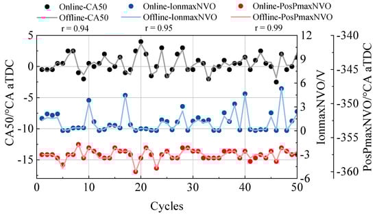 Before applying the system for control, online calculation results should be accurate enough. Figure 7 shows the comparison results between online calculation and offline calculation of three randomly chosen parameters calculated from ion current or cylinder pressure signals. They are CA50, IonmaxNVO, and PosPmaxNVO. The raw data of offline calculation is processed by MATLAB®. A correlation analysis is performed to quantitatively evaluate the accuracy of the online calculation. From Figure 7, it can be seen that the correlation coefficient (r) of three parameters are all higher than 0.9, which belongs to “highly relevant”. The correlation coefficient between offline calculated PosPmaxNVO and online calculated PosPmaxNVO is up to 0.99. Hence, it can be considered that the online calculation results are accurate enough for combustion diagnosis and control application.