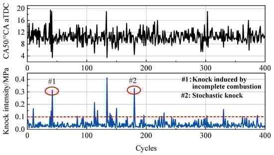 Figure 8 shows the CA50 and knock intensity (KI) for 400 consecutive cycles of high load boundary conditions in HCCI mode. When the knock intensity is greater than 0.1 MPa, it indicates that knock has occurred. From Figure 8, it can be seen that the knock intensity of the partial cycle is even over 0.4 MPa, which is four times the acceptable limit. Such a strong knock limits the further increases in load. After analysis, knock is divided into two types. The first type is caused by incomplete combustion in the previous cycle, which is the unique regression characteristic of compression ignition engines. The other type is stochastic knock. There is no obvious warning for this kind of knock, so it is difficult to control.