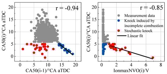 Except for knock induced by incomplete combustion, stochastic knock highlighted with red points should also be controlled. Since the previous cycle of stochastic knock is normal combustion, the only information available for combustion prediction comes from the negative valve overlap period. By analyzing the correlation between CA50(i) and the cylinder pressure or ion current signal characteristic parameters during NVO, it is found that the IonmaxNVO(i) has a certain corresponding relationship with CA50(i) as shown in the right subfigure of Figure 9. The IonmaxNVO of most cycles is lower than 1 V, but the IonmaxNVO of stochastic cycles is particularly high. Similarly, linear regression is performed for these cycles and the fitted Equation (2) can be obtained. The correlation coefficient is also as high as −0.85, which belongs to highly correlated. This phenomenon confirms that the ion current signal is more sensitive to low-temperature chemical reaction than cylinder pressure signal. When the fuel reforming process during NVO is excessively strong, a stronger ion current signal during NVO can be observed, which becomes an indication of stochastic knock. Compared to the previous results conducted by Wick [16], whose purpose is only to prevent the knock induced by incomplete combustion of HCCI engine with only cylinder pressure for combustion control, the criterions found in this article can predict not only the knock induced by incomplete combustion but also stochastic knock. This result shows the superiority of ion current/cylinder pressure synergy in combustion diagnosis.