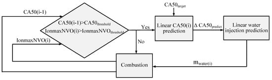 Figure 10 shows the structure of whole control algorithm including knock judgement criterion and knock suprresion method. Real-time CA50 based on cylinder pressure signal and IonmaxNVO based on ion current signal will be caculated in each cycle. The judgment criterions are CA50(i-1) is greater than CA50threshold or IonmaxNVO(i) is greater than IonmaxNVOthreshold. Knock is consisdered to occur as long as any one of the two judgment criterions is met. It should be noted that the two thresholds need to be calibrated and may be different for different operating conditions or engines. Then CA50 of the next cycle can be linearly estimated by Equation (1) or Equation (2). The predicted CA50 is compared to the target CA50 so that ∆CA50predict can be obtained. This deviation is the advance of the combustion phase of the current cycle compared to the normal combustion cycle. Once ∆CA50predict is determined, reasonbale measures should be taken to supress the knock. In this case, intake water injection is employed. The water injection timing is set as −320 °CA aTDC to ensure thorough atomization and evaporation. From the experimental results, the target water injection width mwater(i) can be linearly estimated by Equation (3).