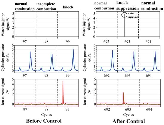 Water injection, cylinder pressure, and ion current signals of three continuous cycles before and after control.