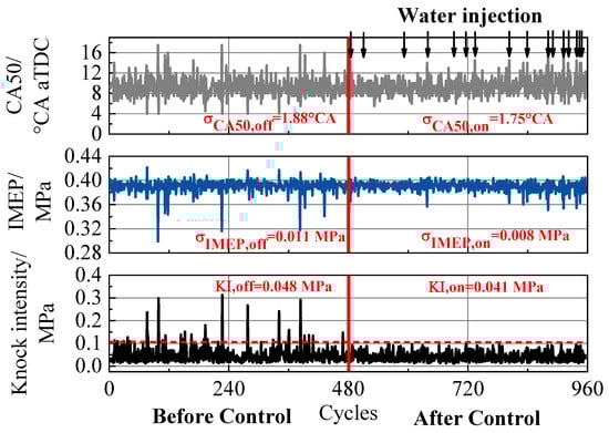 To get an overall evaluation of controller performance, the variation of CA50, IMEP, and knock intensity before and after control are shown in Figure 12. The standard deviation of CA50 (σCA50), the standard deviation of IMEP (σIMEP), and mean knock intensity are three quantitative evaluation indices of controller performance. In the first 480 cycles, CA50 and IMEP fluctuated due to lacking control measures. The CA50 and IMEP of some cycles significantly deviated from the normal value. Besides, the knock intensity of partial cycles has exceeded the limit of 0.1 MPa. After activating the controller, σCA50 is decreased from 1.88 °CA to 1.75 °CA, σIMEP is decreased from 0.011 MPa to 0.008 MPa, and mean knock intensity is decreased from 0.048 MPa to 0.041 MPa. More importantly, the knock intensity of controlled cycles can be kept lower than accceptable limit. Therefore, with this algorithm, knock can be effectively suppressed and the combustion stability has been improved. In this case, only 3.5% of cycles need water injection control intervention. Compared to the stationary continuous water injection, intermittent water injection can save water consumption and reduce the possibility of engine parts corrosion and oil emulsification.