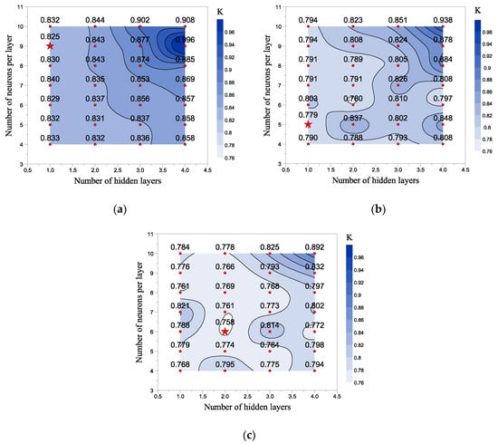 The cost function as shown in Equation (5) is the evaluation index to determine the optimal ANN structure, which has compromised the training error, validation error, and training duration [55]. The combination with the lowest cost will be the optimal hidden layer and neurons for a specific model.
