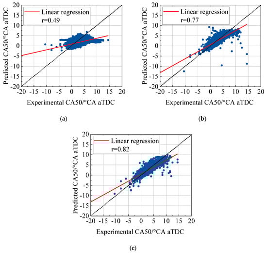 To intuitively present the prediction performance of ANN models, the predicted CA50 of testing data set are compared with the experimental results as shown in Figure 15. In case that the model can predict CA50 correctly, the data points should be distributed near the black short dotted line. From Figure 15a, when the input parameters are only ion current-related parameters, the prediction accuracy of the ANNIC model is low. The experimental CA50 changes between −15 °CA aTDC and 15 °CA aTDC, but the predicted CA50 is not sensitive enough and only changes between −5 °CA aTDC and 5 °CA aTDC. When the input variables are only cylinder pressure-related parameters, the prediction accuracy improves significantly as more data distribute near the black short dotted line, but there are also several outlier cycles. When the input variables are a combination of ion current and cylinder pressure-related parameters, almost all data points are concentrated, distributing around the black short dotted line, so the prediction accuracy has been further improved.