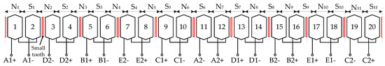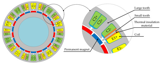 The proposed five-phase PMSM is evolved from the conventional fractional-slot concentrated-winding 20-slot/22-pole five-phase PMSM. By adopting a winding structure with positive and negative coils, the armature reaction inductance between windings of different phases can be eliminated. But there is still slot leakage mutual inductance between adjacent phase windings. By adding small teeth in the common slots among different phase windings, there is no electromagnetic coupling between the phase windings. And the mutual inductance is almost zero [12]. The thermal insulation materials are placed on both sides of small teeth to reduce thermal coupling between adjacent phase windings. The structure of low thermal coupling and no electromagnetic coupling between the phase windings improves the fault tolerance of the motor.